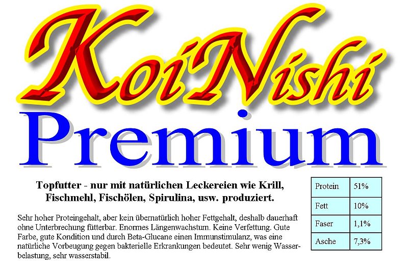 Topfutter - nur mit natürlichen Leckereien wie Krill, Fischmehl, Fischölen, Spirulina, usw. produziert. Sehr hoher Proteingehalt, aber kein übernatürlich hoher Fettgehalt, deshalb dauerhaft ohne Unterbrechung fütterbar. Enormes Längenwachstum. Keine Verfettung. Gute Farbe, gute Kondition und durch Beta-Glucane einen Immunstimulanz, was eine natürliche Vorbeugung gegen bakterielle Erkrankungen bedeutet. Sehr wenig Wasserbelastung, sehr wasserstabil. Protein : 51 % Fett : 10 % Asche : 7,3 % Rohfaser : 1,1 %