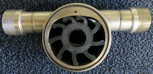 Der Pumpenkopf lässt sich auch leicht öffnen, um z.B. den Impeller zu tauschen. Nur eine Schraube (beim 22000er zwei) ist zu lösen, dann kann der vordere Pumpenkopfdeckel abgenommen.