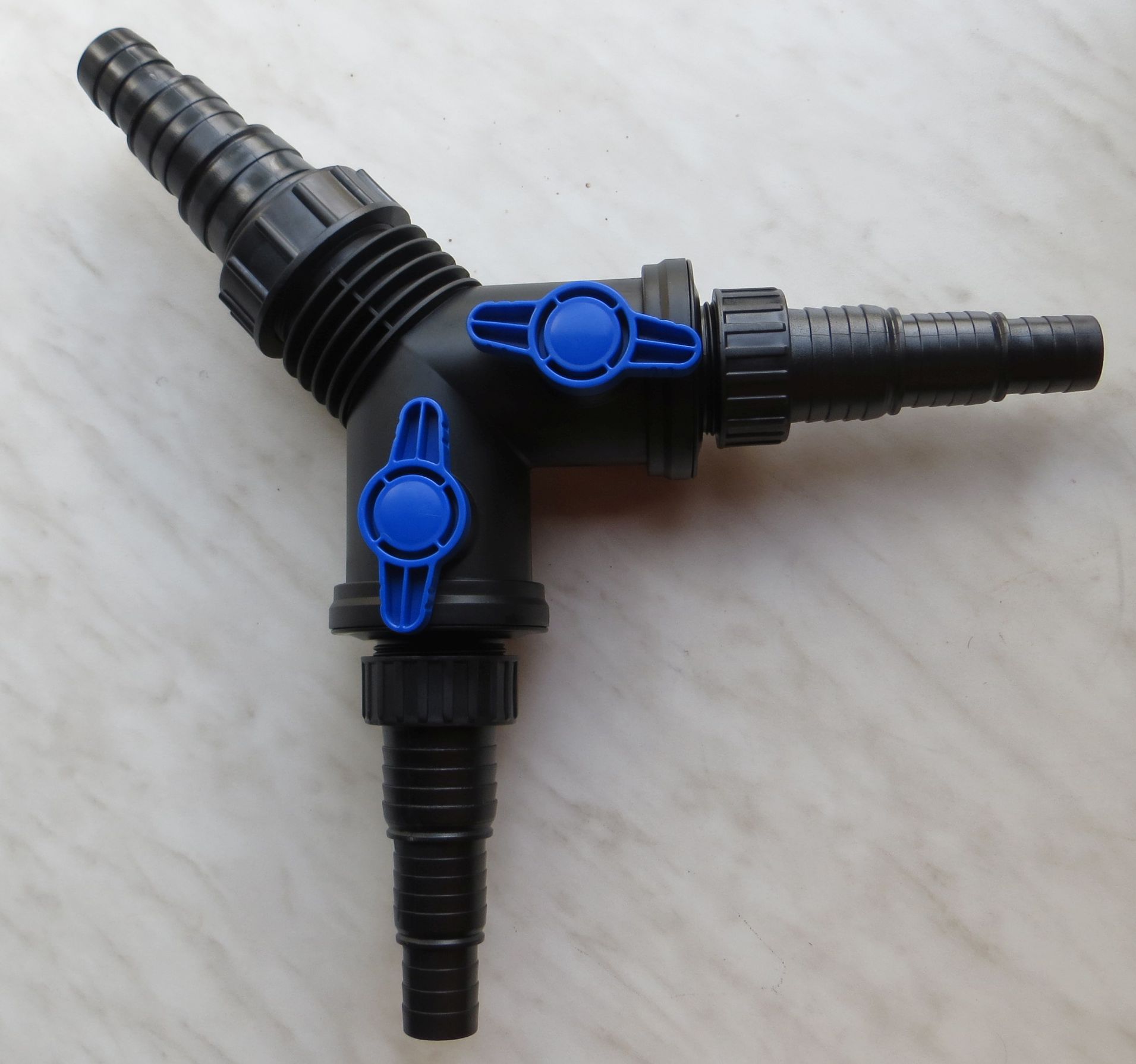 Dieser 3 Wege Verteiler ist extrem praktisch und für viele Problemlösungen geeignet. Er verfügt an zwei Wegen über einen Regulierungshahn. Mitgeliefert wird unter anderem auch ein Filterkorb. So lässt sich z.B. auf einfache Weise die Zuflussregelung bei der Verwendung von Skimmern steuern. Die Pumpe saugt dann auf einem Weg vom Skimmer, auf dem anderen Weg durch den montierten Filterkorb - und das alles komplett nach Wunsch regelbar. Auch als Bypaßregelung für Filter/UVC einsetzbar.