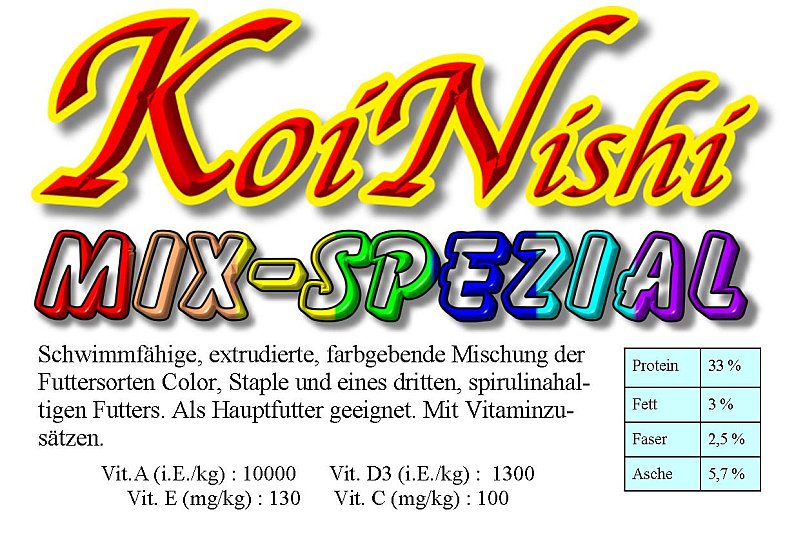Das bekannte und beliebte KoiNishi Mix Spezial Futter im 5 kg Beutel.. Schwimmfähige, extrudierte, farbgebende Mischung der Futtersorten Color, Staple und eines dritten, spirulinahaltigen Futters. Als Hauptfutter geeignet. Mit Vitaminzusätzen. Protein : 33 % Fett : 3 % Faser : 2,5 % Asche : 5,7 % Vit.A (i.E./kg) : 10000 Vit. D3 (i.E./kg) : 1300 Vit. E (mg/kg) : 130 Vit. C (mg/kg) : 100