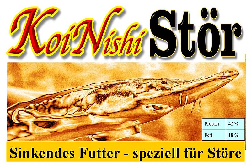 Sinkendes Hauptfutter für Störe. Beliebt und bewährt. Mit Vitaminzusätzen. Protein : 42 % Fett : 18 % Faser : k.A. Asche : k.A. Vit.A (i.E./kg) : k.A. Vit. D3 (i.E./kg) : k.A. Vit. E (mg/kg) : k.A. Vit. C (mg/kg) : k.A.