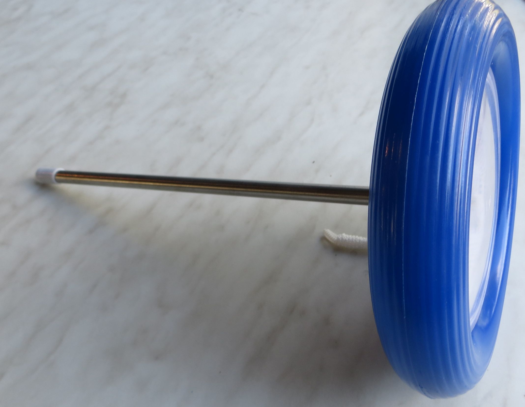 Rundes Schwimmthermometer mit Ankerschnur, mit Zeiger zur leichten Ablesung der Wassertemperatur. 30 cm lange Sensorstange. 18 cm Durchmesser.